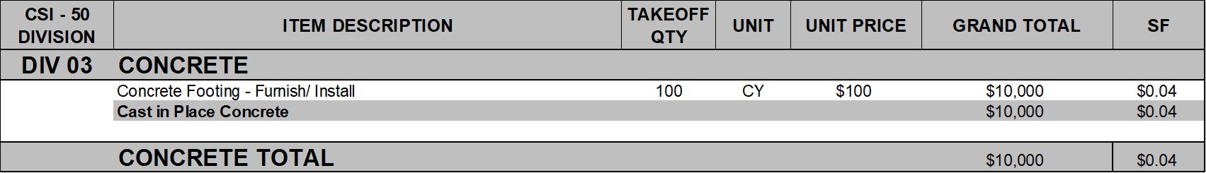 Your proposal will list each construction task/item as a single separate “line item” within its corresponding division and subcategory (as we have previously defined). As an example, the construction task Concrete Footing – Furnished and Installed will be listed in DIV 03 – Concrete under its subcategory Cast in Place Concrete. The line item includes information such as Takeoff Quantity, Unit, Unit Price and the calculated Total Cost of that line item.