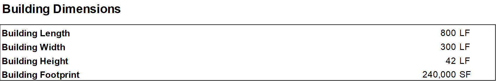 Next, we should have information on Building Dimensions readily available, such as Building length, width, and building footprint.