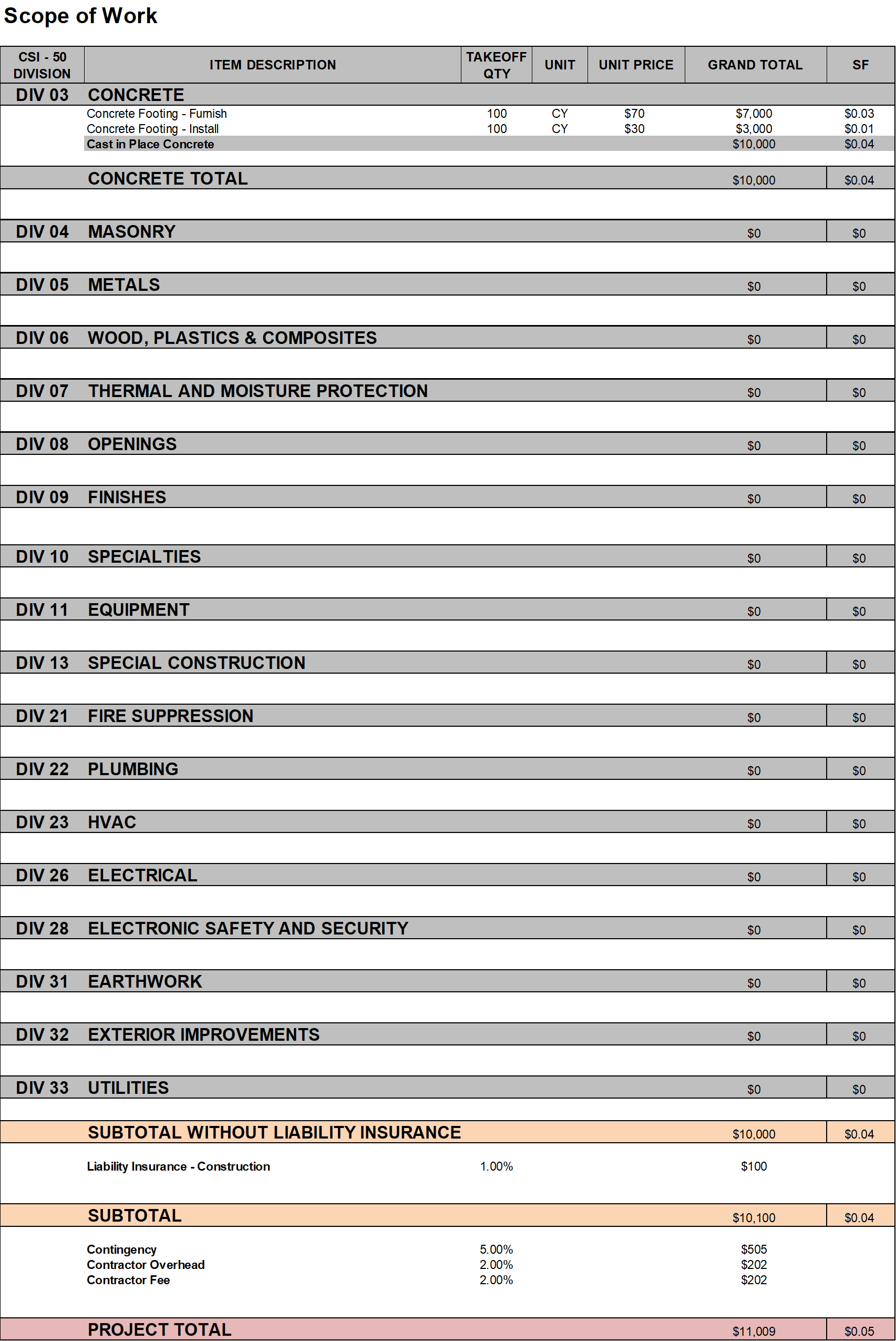 Now comes the main part of your spreadsheet – the Scope of Work. What you see below is an example of how you can organize your Scope of Work section. Your company will probably have their own version of it.