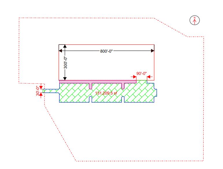 Our fictitious residential building has a building footprint of 300 LF x 800 LF (240,000 SF). The parking area will be exclusively for cars – a conventional light duty asphalt pavement is sufficient for this type of usage. The client has clarified that the building will be comprised of four residential levels, and a basement level for additional car parking, and storage. A large patio, xxx LF x xxx LF (TBD), will be in the center of the building. This patio is considered as an interior to the building.